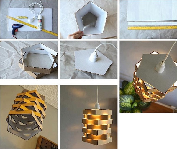 Để trang trí căn phòng của mình thêm ấn tượng, chúng ta hoàn toàn có thể tái chế thùng carton thành đèn treo trong nhà. Các loại vật dụng cần chuẩn bị bao gồm kéo, thùng carton cũ và băng keo. Chúng ta sẽ cắt bìa carton thành từng cạnh với chiều dài và rộng tùy theo mong muốn cá nhân. Sau khi có được 5 cạnh, chúng ta sẽ ghép chúng lại bằng keo để tạo thành đèn treo tường hình lục giác.
