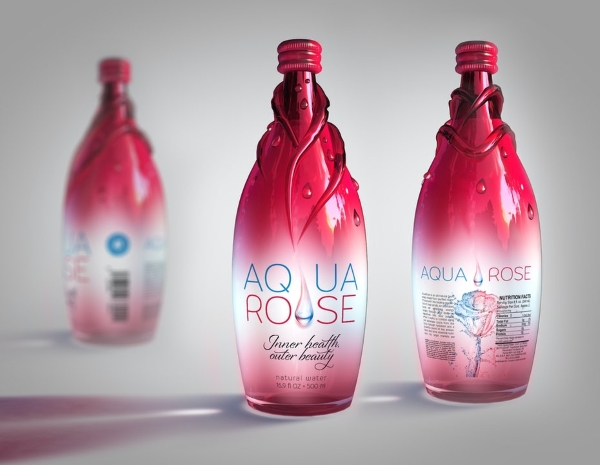 Aqua Rose là nước đóng chai, bao gồm các đặc tính chữa bệnh của cánh hoa hồng. Năng lượng sảng khoái từ nước tinh khiết này được cho là giúp tăng cường vẻ đẹp và dinh dưỡng. Để hướng đến những người tiêu dùng giàu có, công ty đã quyết định thiết kế 3D cho chai của họ, biến một chai bình thường thành một thứ độc quyền.