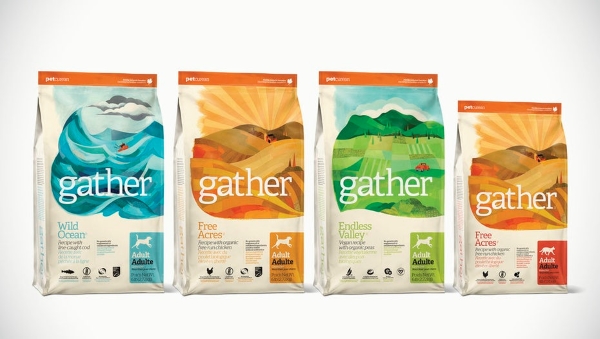 Gather Premium Pet Food cung cấp thức ăn hữu cơ, bền vững và không có GMO được chứng nhận cho chó và mèo. Công ty tự hào tìm nguồn sản phẩm của mình từ một số nhà cung cấp chọn lọc và đang tìm kiếm một thiết kế bao bì phù hợp với các giá trị của nó.