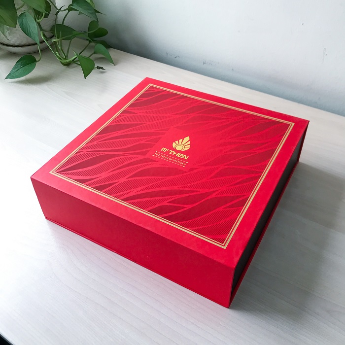 Việc sử dụng hộp quà bằng chất liệu Carton lạnh 2mm bồi giấy Couches 150 giúp Printgo có thể in ấn một cách dễ dàng và rõ nét trên nắp hộp. Kiểu hộp nắp lật nam châm chắc chắn là sự lựa chọn tuyệt vời dành cho các sản phẩm của M'Then. Bên cạnh đó, sử dụng chất liệu này giúp hộp quà có được độ cứng cáp nhất định, tránh tình trạng móp méo khi gặp phải những va chạm ngoài ý muốn trong lúc vận chuyển. Đảm bảo hộp quà Tết đến được tay người nhận trong tình trạng nguyên vẹn nhất có thể.