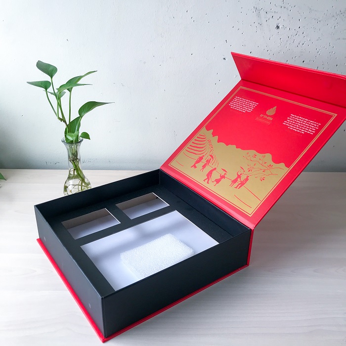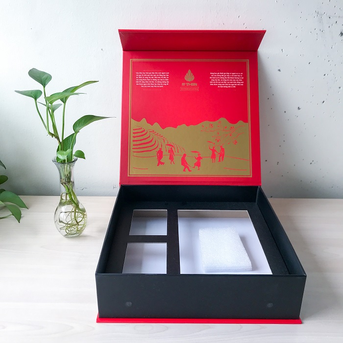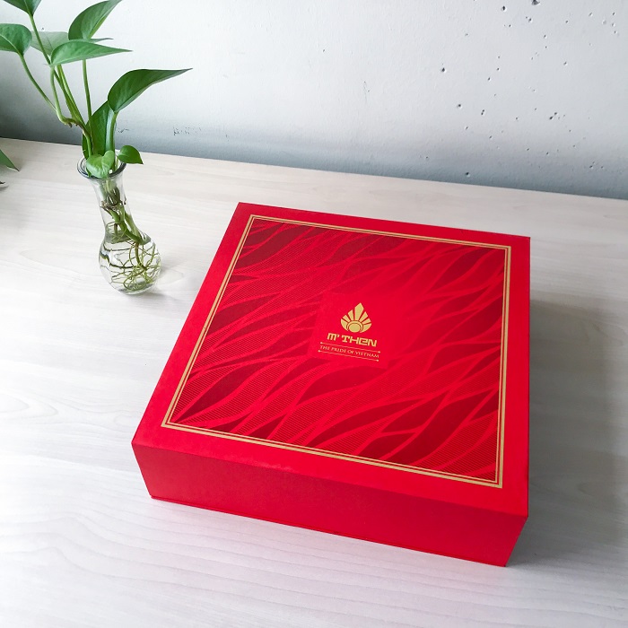 Hộp quà tết bao gồm một hộp quà với quy cách carton lạnh nắp nam châm và một khay định hình bên trong. Khay định hình được làm theo yêu cầu riêng của M'Then để giúp cố định sản phẩm chắc chắn, an toàn hơn!