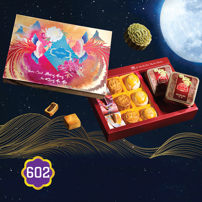 Hộp bánh trung thu Đại Phát cao cấp không chỉ là một chiếc hộp đựng thông thường, mà còn là một tác phẩm nghệ thuật tinh tế. Thiết kế nổi bật với hình ảnh đôi phượng hoàng - biểu tượng của sự phú quý, may mắn và bình an, được in một cách tỉ mỉ và sắc nét trên bề mặt hộp.