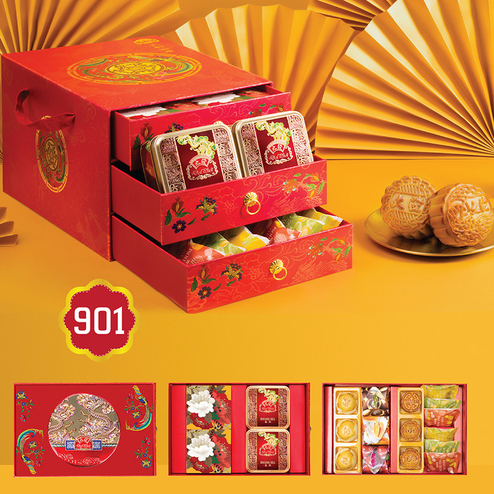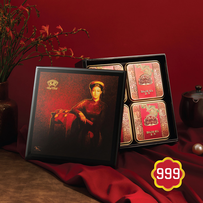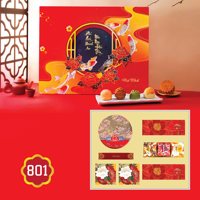 Màu sắc của hộp bánh, với sự kết hợp hài hòa giữa màu vàng sang trọng và màu đỏ thể hiện cho sự may mắn, tạo nên một ấn tượng mạnh mẽ ngay từ ánh nhìn đầu tiên.