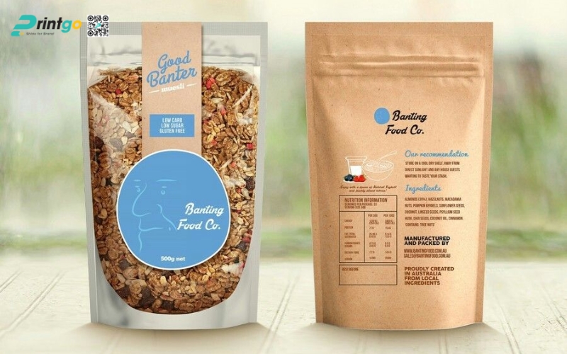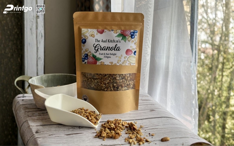Túi zipper là sự kết hợp hoàn hảo giữa tính tiện dụng và thẩm mỹ hiện đại. Khóa kéo giúp bảo quản granola luôn giòn thơm sau mỗi lần mở, đồng thời mang đến trải nghiệm người dùng dễ chịu và gọn gàng. Nhiều mẫu túi còn được thiết kế thêm phần cửa sổ trong suốt để khách hàng nhìn thấy sản phẩm bên trong, một chi tiết nhỏ nhưng tăng độ tin cậy đáng kể. Với vẻ ngoài trẻ trung, túi zipper rất được ưa chuộng trong các dòng granola dành cho giới văn phòng và người yêu thích lối sống lành mạnh.