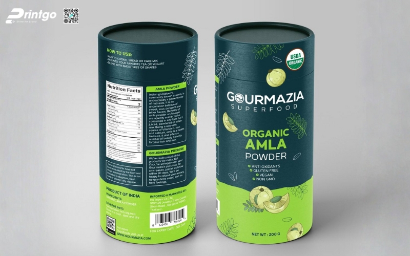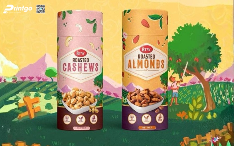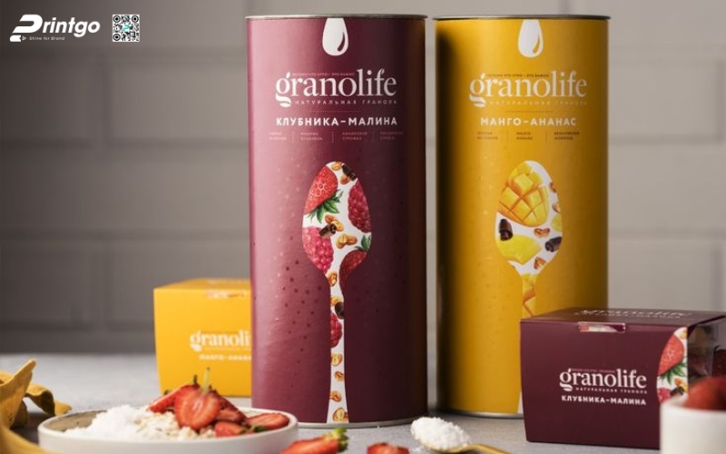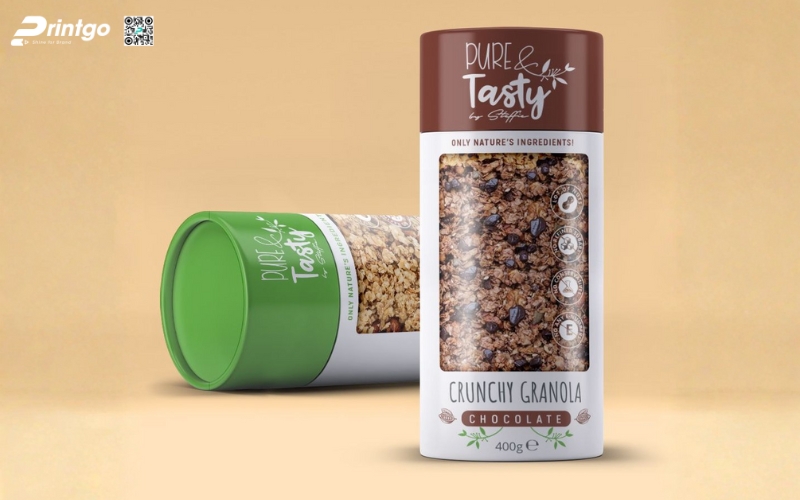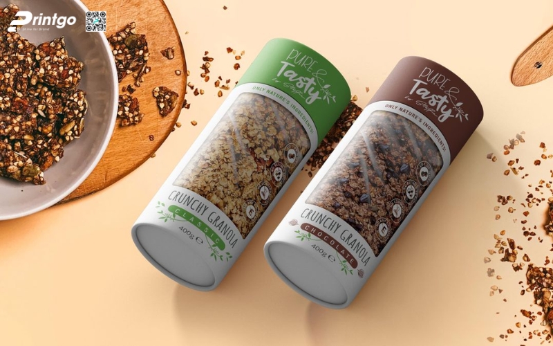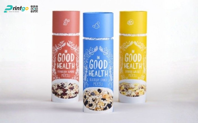 - Hộp trụ tròn: Dạng hộp độc đáo, dễ tạo ấn tượng thị giác. Thường dùng cho granola mix, granola hạt nguyên, mang lại cảm giác cao cấp và khác biệt so với túi đứng truyền thống.