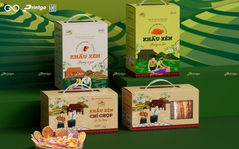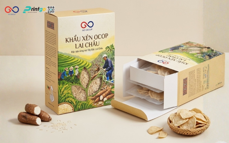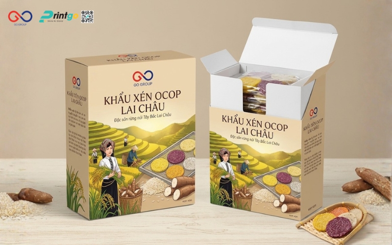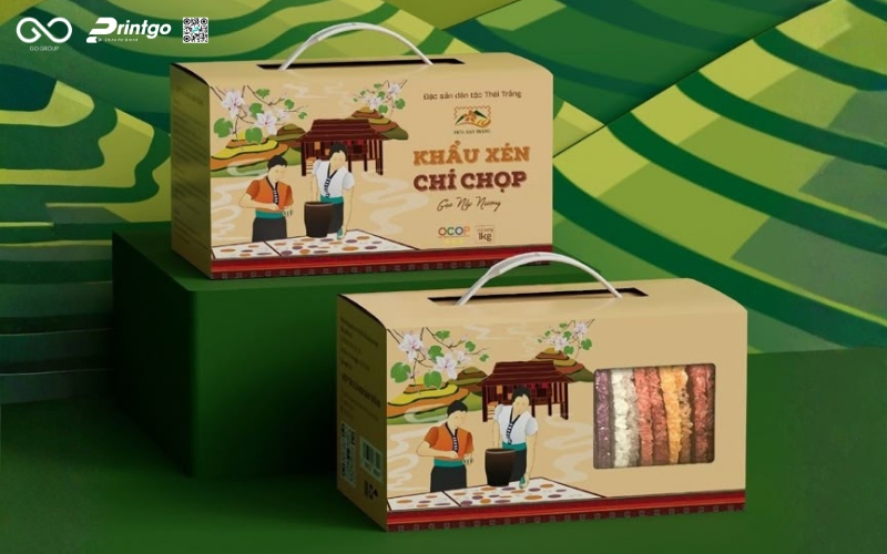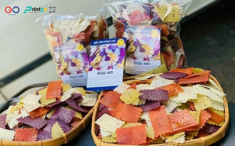 Để phù hợp với nhiều nhu cầu của người tiêu dùng, nên cung cấp đa dạng quy cách đóng gói: từ gói nhỏ 100-200g cho khách thử sản phẩm, đến gói 500g – 1kg cho nhu cầu gia đình. Printgo gợi ý có thể bổ sung túi giấy kết hợp cửa sổ nhựa cho cảm giác thân thiện môi trường hoặc hộp giấy Ivory nhỏ cho dòng bán lẻ cao cấp. Mọi thiết kế đều cần đồng bộ về màu sắc và biểu tượng thương hiệu (ví dụ sử dụng hoa văn dân tộc Tây Bắc đặc trưng) để khách dễ nhận biết. Với cách làm này, bao bì khẩu xén Lai Châu vừa tối ưu chi phí, vừa tăng khả năng thu hút và thuyết phục khách hàng mua dùng.