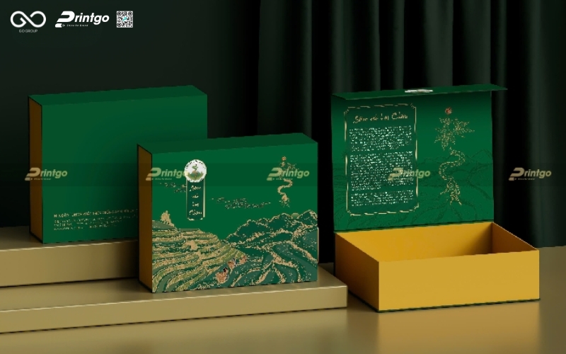 Bao bì quà tặng cần tạo ấn tượng cao cấp và mang tính trang trọng. Printgo khuyến nghị sử dụng hộp cứng cao cấp để bảo vệ sản phẩm và nâng tầm giá trị. Ví dụ, có thể chọn hộp giấy bồi dày (như giấy Ivory, Couche) với nắp khít hoặc nam châm, phối màu hài hòa. Thiết kế hộp nên có điểm nhấn sang trọng: có thể ép kim vàng, dập nổi họa tiết hoặc in UV các hoa văn bản địa để tăng sự tinh tế. Đường viền hộp hoặc tay cầm bằng dây thừng (rope) cũng góp phần làm quà tặng trông trang nghiêm hơn. Một hộp khẩu xén Lai Châu dành làm quà có thể có lớp lót bên trong (mút xốp hoặc giấy nhung) để giữ sản phẩm không bị va đập và tạo hiệu ứng sang trọng khi mở hộp.
