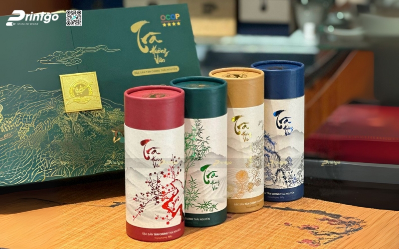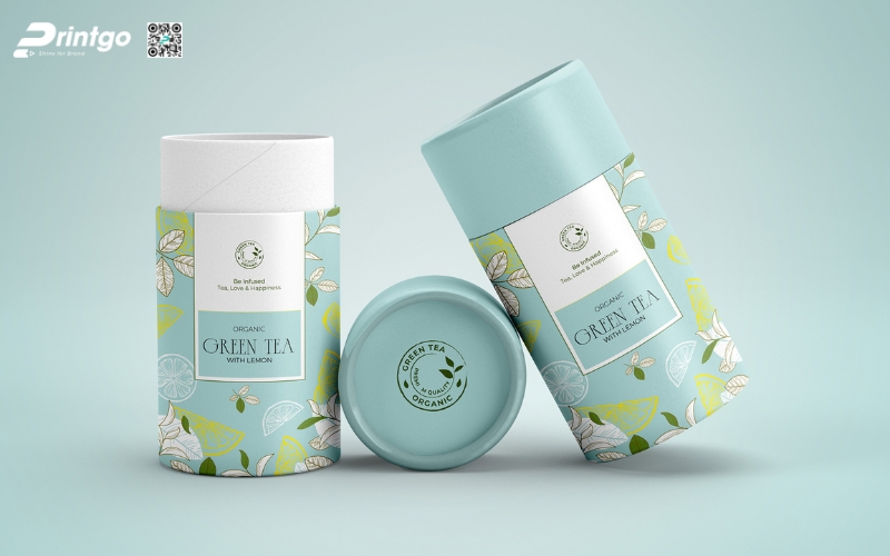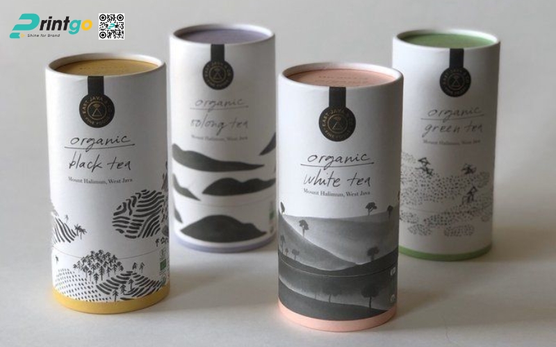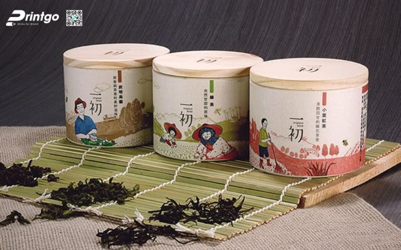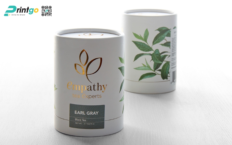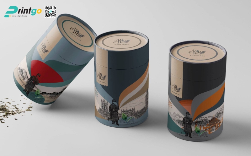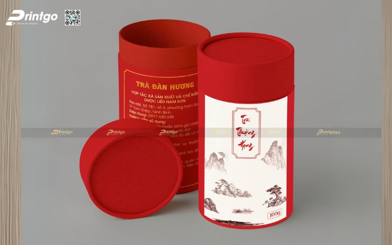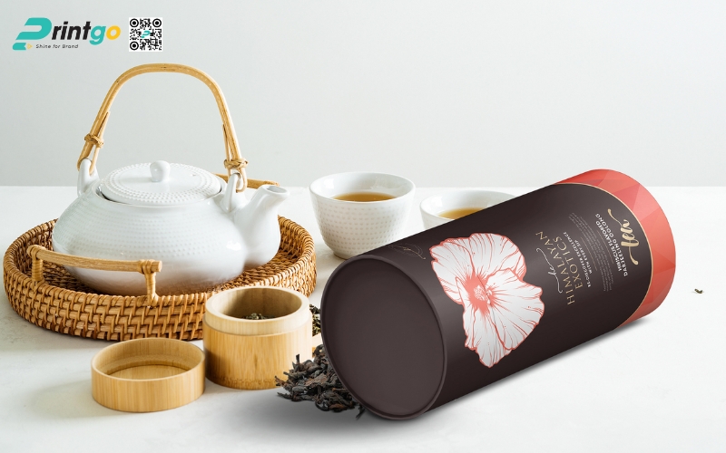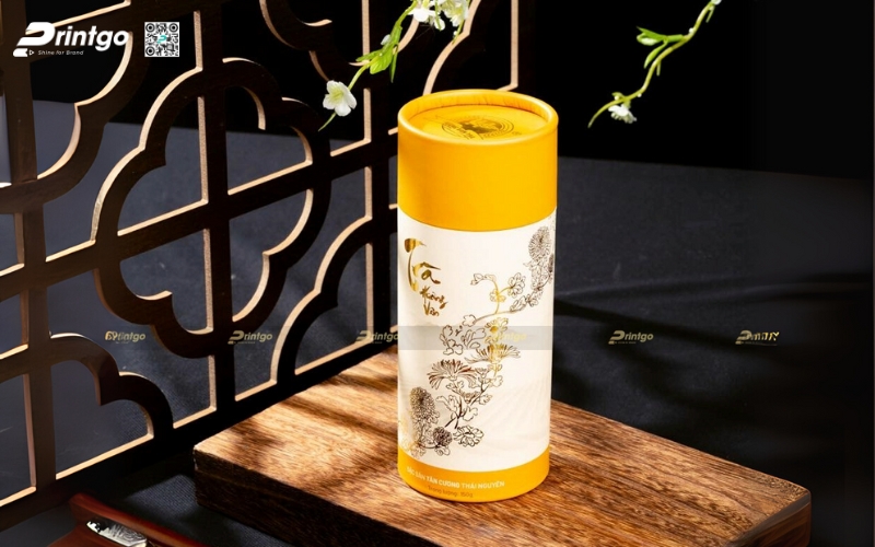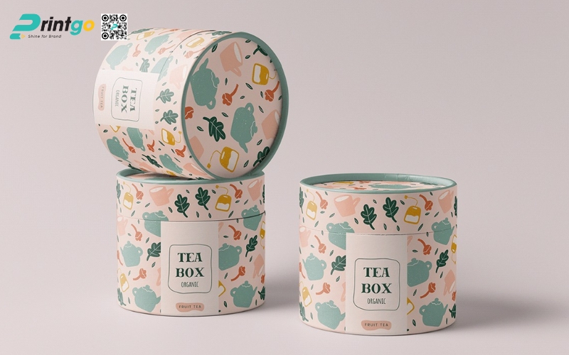 - Hộp trụ tròn: Dạng ống hình trụ, thường làm bằng giấy cứng hoặc thiếc. Ưu điểm là giữ form chắc chắn, trông rất cao cấp. Thường dùng để đóng gói trà lá nguyên chất hoặc trà biếu, giúp sản phẩm nổi bật và sang trọng hơn.