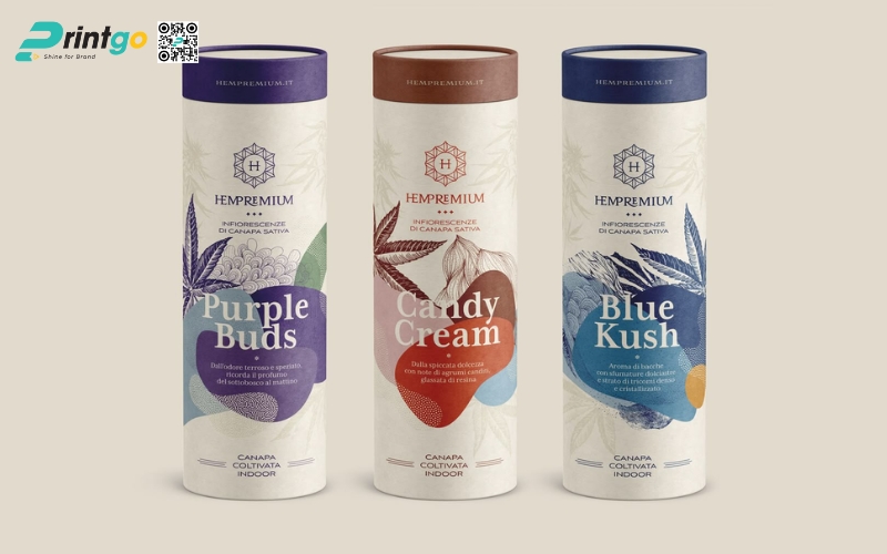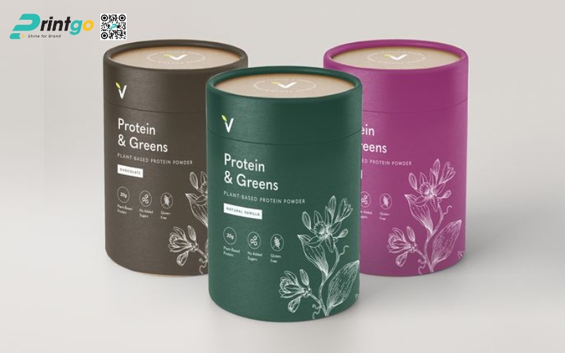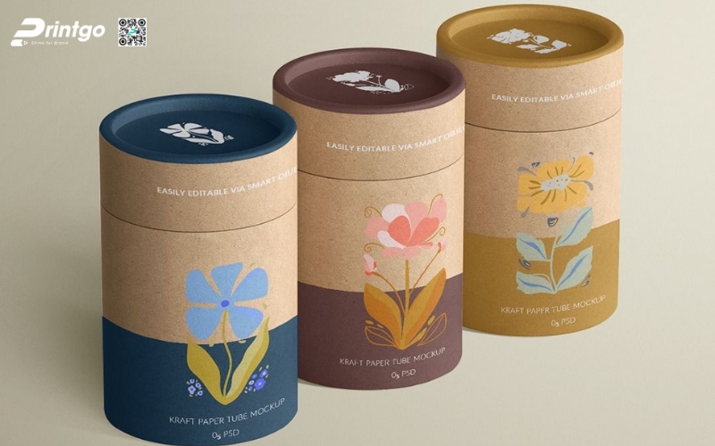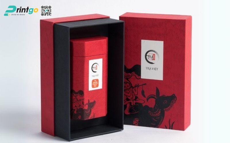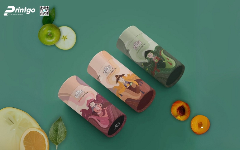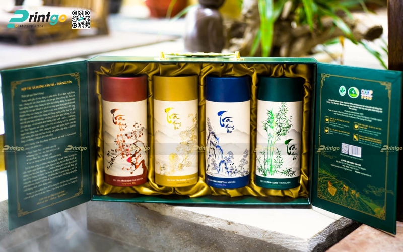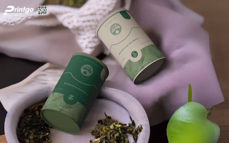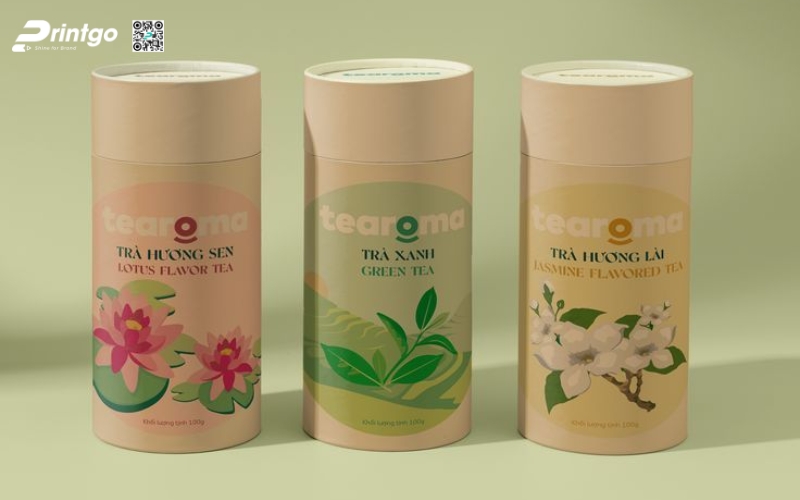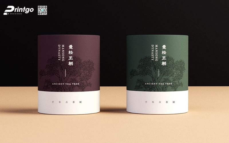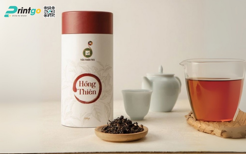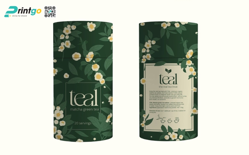 - Hộp trụ tròn: Dạng ống hình trụ, thường làm bằng giấy cứng hoặc thiếc. Ưu điểm là giữ form chắc chắn, trông rất cao cấp. Thường dùng để đóng gói trà lá nguyên chất hoặc trà biếu, giúp sản phẩm nổi bật và sang trọng hơn.