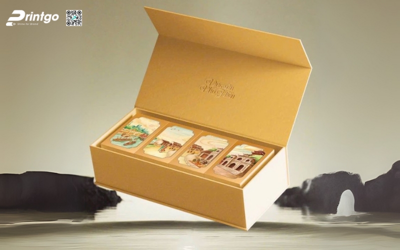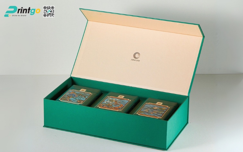 - Hộp cứng cao cấp dạng nam châm: Có nắp đóng mở bằng nam châm, rất hiện đại và tiện lợi. Khi mở hộp, khách hàng sẽ cảm nhận được sự tinh tế, thường được dùng cho các dòng trà quà tặng hoặc thương hiệu muốn tạo ấn tượng mạnh mẽ.