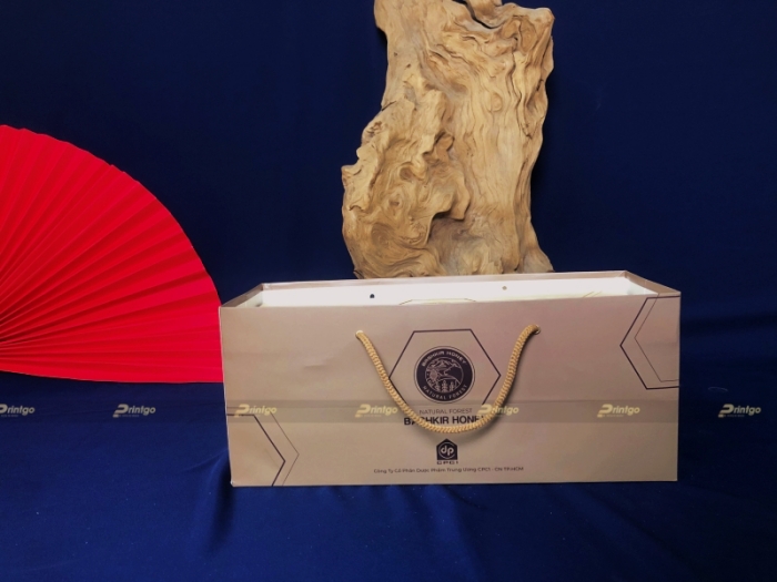 Để giúp khách hàng dễ dàng trong quá trình di chuyển, bộ sản phẩm không thể thiếu được chiếc túi đựng bằng giấy. Thiết kế tối giản đồng nhất với phần hộp gỗ đựng bên trong, màu sắc hạ xuống 1 tone, trầm hơn chút. Giấy couche với bề mặt phẳng, bóng, mịn, độ sáng vừa phải, chắn sáng tốt, bám mực và hấp thụ mực tốt nhờ được tráng phủ một lớp cao lanh là lựa chọn hoàn hảo. Sản phẩm được hoàn thiện từng chi tiết nhỏ như quai túi, màu sắc hay chất lượng in.