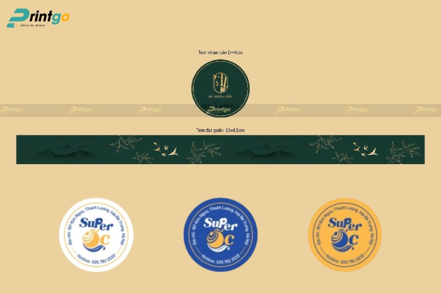Sticker và tem nhãn (Labels & Stickers): Gắn trực tiếp lên sản phẩm, giúp người tiêu dùng đọc thông tin nhanh (hạn sử dụng, thành phần, hướng dẫn pha chế). Thiết kế nhỏ gọn, sử dụng màu sắc nhận diện để khách hàng dễ nhận ra thương hiệu. Nhãn tem nên rõ ràng, có mã QR để truy xuất nguồn gốc.