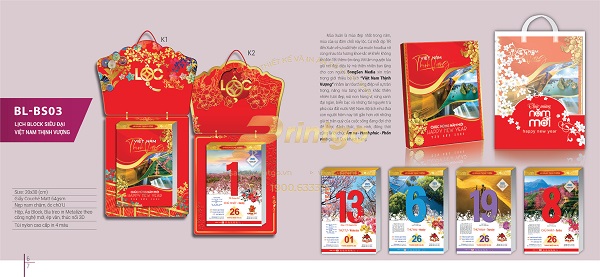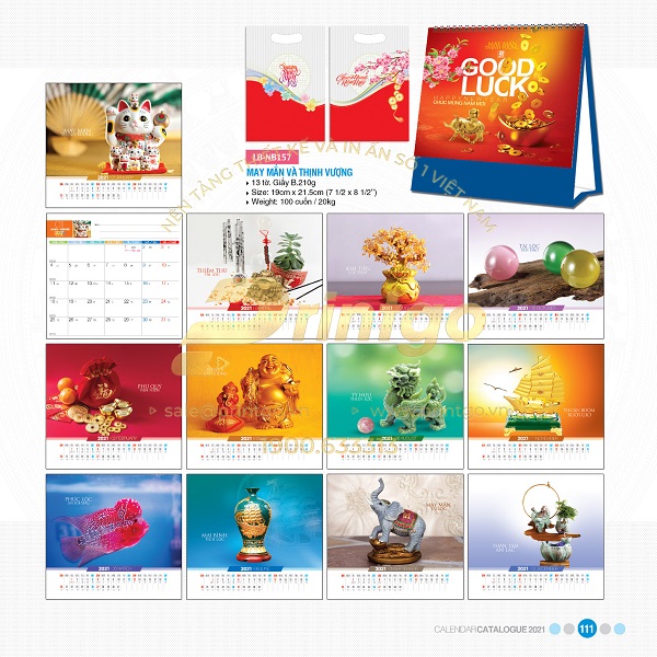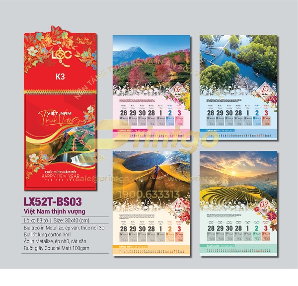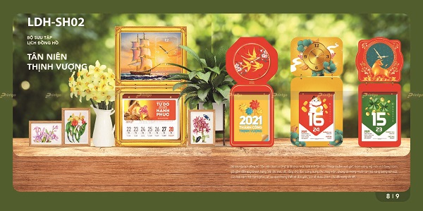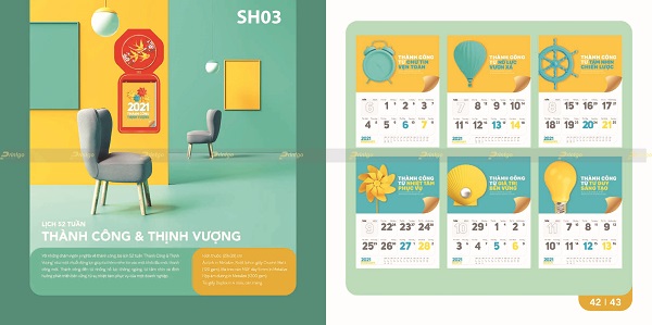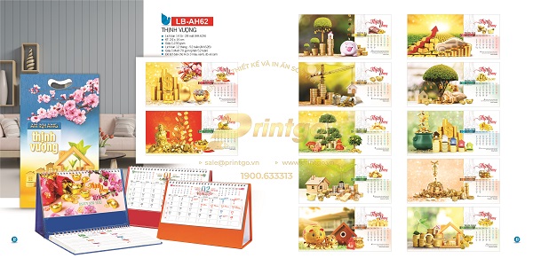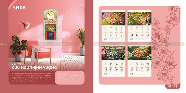 Với tinh thần đó, bộ lịch tết chủ đề Thịnh vượng có thiết kế với đa dạng các hình ảnh, hình tượng mang nhiều ý nghĩa khác nhau. Có mẫu lịch tết lấy cảm hứng thiết kế từ hình ảnh quê hương đất nước tươi đẹp đang ngày càng phát triển, phồn vinh và thịnh vượng, gửi gắm mong ước về một cuộc sống ấm no và hạnh phúc. Có mẫu lịch là bức tranh 9 con cá chép bơi lội cùng nhau tượng trưng cho sự dư dả dài lâu, hay còn có câu “Như cá gặp nước” mang hàm nghĩa vạn sự như ý, thuận lợi và hanh thông. Cũng có mẫu lịch khác lấy ý tưởng thiết kế từ những hình ảnh phong thủy mang ý nghĩa tài lộc, giàu sang như tiền vàng, túi vàng, vòng ngọc, trâu vàng,… là biểu tượng cho may mắn thịnh vượng, phát tài phát lộc.