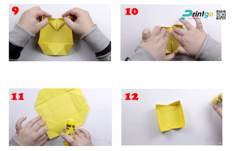 - Gấp các đường kẻ để tạo bản lề, gấp đôi các tam giác bên trong để cố định, rồi dùng keo dán chặt các phần lại nhằm giữ hình dạng hộp.