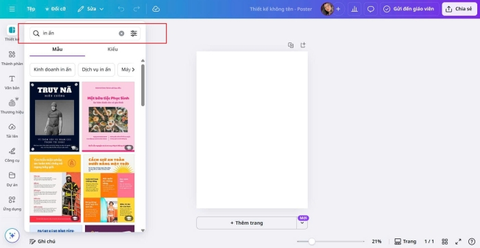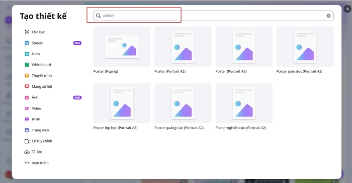 Sau khi mở giao diện thiết kế, bạn sẽ thấy Canva cung cấp hàng trăm mẫu poster chuyên nghiệp. Bạn có thể: