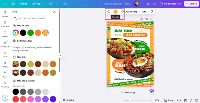 Để thay đổi màu nền, hãy nhấp vào phần nền của poster. Trên thanh công cụ, chọn ô màu để mở bảng màu và chọn tông màu phù hợp với thiết kế của bạn. Canva cũng hỗ trợ bảng màu thương hiệu nếu bạn dùng Canva Pro.