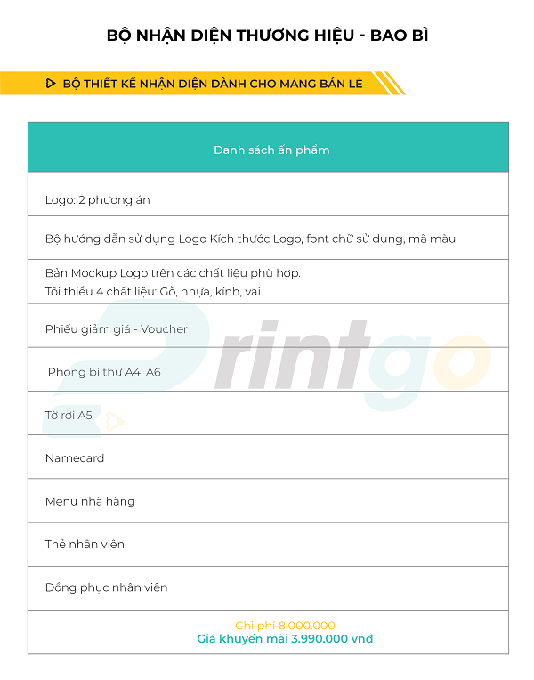 Printgo cung cấp dịch vụ thiết kế bộ nhận diện thương hiệu dành cho mảng bán lẻ chuyên nghiệp với mức giá vô cùng phải chăng và ưu đãi nhất trên thị trường hiện nay. Trong bộ thiết kế nhận diện dành cho mảng bán lẻ của Printgo bao gồm các ấn phẩm thiết kế sau: 2 phương án logo, bộ hướng dẫn sử dụng logo, bản mockup logo trên các chất liệu phù hợp, phiếu giảm giá Voucher, phong bì thư A4 và A6, tờ rơi A5, namecard, menu nhà hàng, thẻ nhân viên và đồng phục nhân viên.