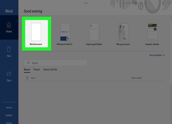 Bước 2: Nhấn vào tùy chọn Blank Document để mở ra tài liệu trống. Đây là tuỳ chọn đầu tiên trong danh sách các loại tập tin mới.