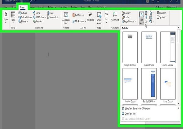 Nhấp vào Text Box ở gần góc trên bên phải Word.