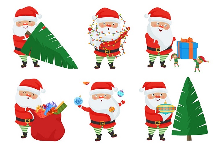 File vector tổng hợp bức hình ông già Noel bên các họa tiết trang trí giáng sinh như hộp quà, đèn nháy, cây thông,..