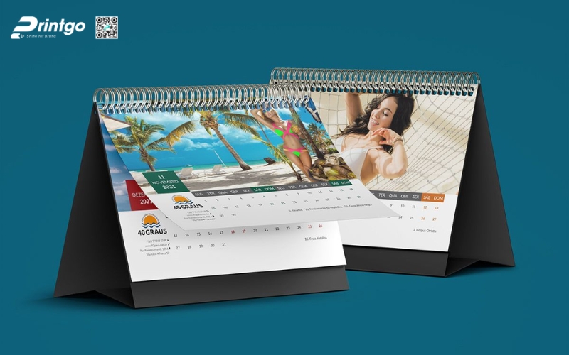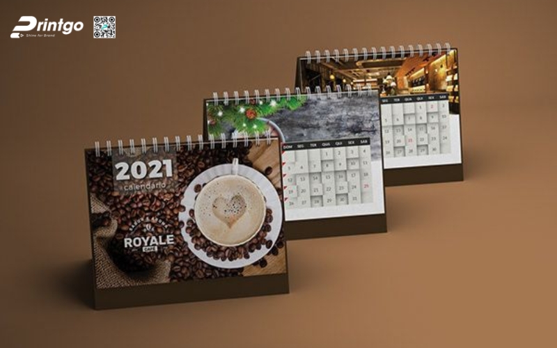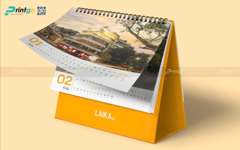 Lịch để bàn chữ A: Thiết kế đơn giản, tiện dụng, phù hợp đặt ở bàn làm việc. Mẫu lịch này thường có phần bìa in logo và thông tin doanh nghiệp rõ nét, giúp tăng khả năng nhận diện thương hiệu.