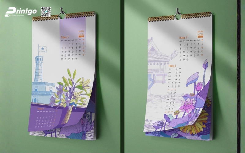 Lịch treo tường lò xo: Mẫu lịch này có kích thước lớn, in được hình ảnh phong cảnh, tranh dân gian, hoặc sản phẩm nổi bật của doanh nghiệp. Nhờ màu sắc tươi sáng và thiết kế sang trọng, in lịch treo tường luôn là lựa chọn hàng đầu cho các chương trình tặng khách hàng.