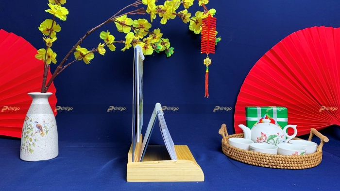 Phần thứ 3 đó chính là đế gỗ, giúp cố định phần ruột lịch và đựng phần giấy note. Ngoài ra, phần đế lịch còn có một vai trò đặc biệt quan trọng đó chính là công cụ để quảng bá thương hiệu. Logo, tên thương hiệu, cũng như địa chỉ, các thông tin liên hệ… được khắc laser trên đế lịch. Giúp thương hiệu tiếp cận khách hàng một cách tự nhiên nhất, trong suốt 365 ngày trong năm, nhờ vậy thương hiệu có thể dễ dàng được ghi nhớ trong tâm trí khách hàng. Phần đế gỗ còn giúp cuốn lịch trở nên sang trọng hơn, thay vì chỉ được sử dụng ở bàn làm việc, trong phòng riêng thì cuốn lịch còn được trưng bày ở khu vực lễ tân hay bàn tiếp khách.
