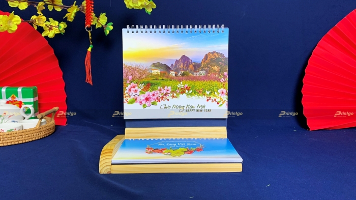 Quy cách lịch để bàn vừa nhỏ gọn lại có thể đặt trên mọi địa hình, giúp người dùng dễ dàng di chuyển. Bộ lịch được chia làm 3 phần: Phần ruột lịch được tập trung thể hiện với các bức tranh thiên nhiên, bên cạnh đó không thể thiếu thông tin chi tiết về ngày tháng năm. Để những bức tranh này có được màu sắc tươi mới, bắt mắt thì giấy couche là đề xuất tốt nhất lúc này. Nhờ có lớp cao lanh được tráng phủ trên bề mặt nên giấy có được độ phẳng, bóng và độ mịn như mong muốn, đảm bảo bám mực và hấp thụ mực tốt.