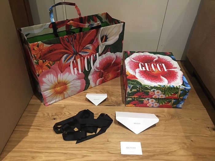 Hộp giấy Gucci đính kèm nơ cài xinh xắn