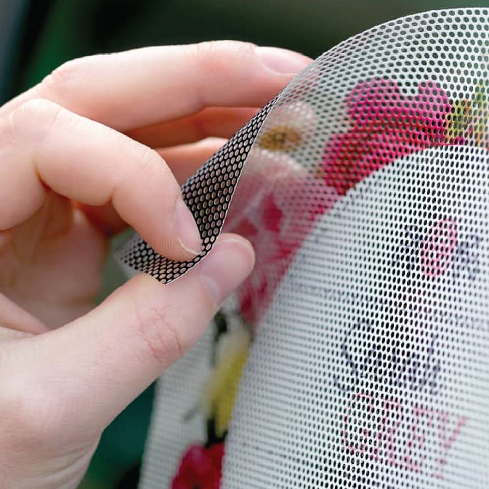 Quan sát gần mắt decal lưới, bạn sẽ thấy chúng có rất nhiều lỗ lớn trải đều trên bề mặt. Tiếp đó, sâu bên trong là lớp màng để tránh ánh sáng trực tiếp. Do đó sản phẩm được dùng là đồ trang trí văn phòng, thiết bị điện tử và bảo vệ cửa kính.