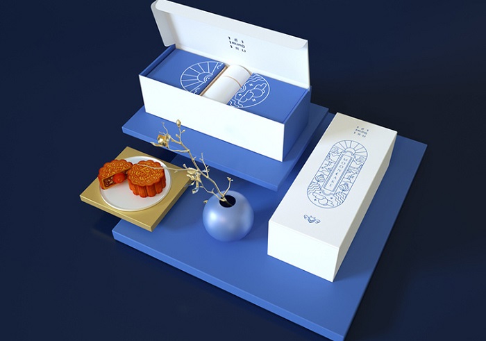 Mẫu hộp cứng đựng bánh với tông xanh-trắng đơn giản