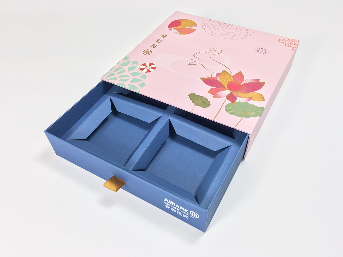 Hộp nắp trượt thuộc dạng quy cách độc đáo và còn khá mới mẻ trên thị trường. Thiết kế kiểu này mang lại cảm giác độc lạ, khác biệt cho khách hàng và tạo được ấn tượng với những người sẽ nhận được món quà trung thu này. Nhờ một đoạn dây nhỏ ở phần đầu của nắp hộp, người dùng chỉ cần thao tác kéo đơn giản là đã có thể mở dễ dàng. Ngoài ra, với mẫu bao bì này, người tiêu dùng cũng có thể yêu cầu sản xuất theo dạng hộp hai tầng, vừa nâng cao tính thẩm mỹ, vừa gia tăng giá trị món quà và hình ảnh thương hiệu.