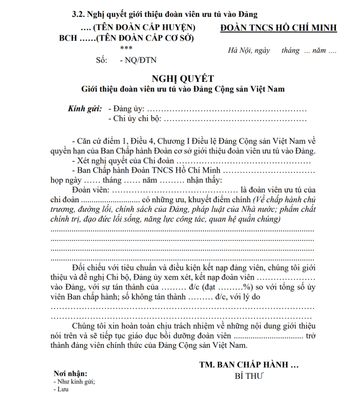 Đoàn cơ sở ra nghị quyết giới thiệu đoàn viên ưu tú cho Đảng, gửi nghị quyết kèm biên bản họp và hồ sơ lên chi bộ Đảng.