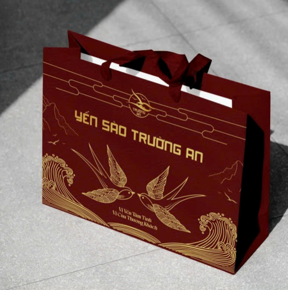 Không chỉ tập trung vào hộp đựng, túi giấy đi kèm cũng đóng vai trò quan trọng trong bộ bao bì sản phẩm. Với thiết kế đồng bộ về màu sắc, chất liệu và phong cách, túi giấy không chỉ giúp tăng tính nhận diện mà còn mang lại sự thuận tiện cho khách hàng khi sử dụng. Sự kết hợp hài hòa này đã giúp hộp đựng yến sào Trường An trở thành không chỉ là một sản phẩm bao bì mà còn là một món quà tặng đẳng cấp, thể hiện trọn vẹn giá trị của yến sào cao cấp.
