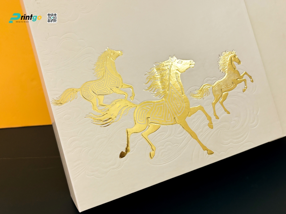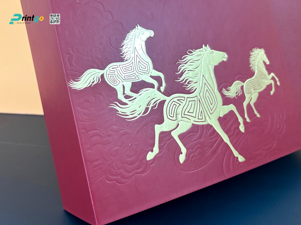 Ép kim (Hot Foil Stamping): là quy trình sử dụng khuôn kim loại đã khắc hình ảnh, gia nhiệt ở nhiệt độ cao để ép lớp màng kim loại (foil) mỏng dính chặt lên bề mặt giấy. Trên nền hộp trang nhã, các đường nét line-art hình chú ngựa và logo thương hiệu được ép kim vàng tạo nên sự tương phản mạnh mẽ. Ánh kim loại bắt sáng lấp lánh dưới ánh đèn, tạo điểm nhấn thị giác sang trọng, thu hút mọi ánh nhìn. Kỹ thuật này không chỉ làm nổi bật hình tượng năm Mã mà còn ngầm khẳng định giá trị "vàng son", phú quý của món quà.