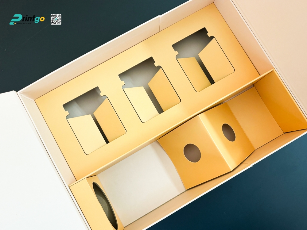 Khay định hình sản phẩm (Insert Tray): Bên trong vẻ ngoài hào nhoáng, khay định hình đóng vai trò như một "người bảo vệ" thầm lặng nhưng không thể thiếu. Khay được bế khuôn chính xác theo kích thước của từng vật phẩm bên trong như hũ hạt, hộp trà và đặc biệt là chai rượu. Đối với set quà có rượu vang, Printgo thiết kế bộ khay có đáy vách ngăn chắc chắn và phần chốt định vị cổ chai rượu. Tác dụng của thiết kế này là khóa chặt chai rượu tại một vị trí, ngăn chặn tuyệt đối tình trạng xô lệch, va đập gây vỡ trong quá trình vận chuyển đường dài. Khay định hình không chỉ bảo vệ sản phẩm mà còn giúp tổng thể set quà trở nên gọn gàng, khoa học và chuyên nghiệp khi mở ra.