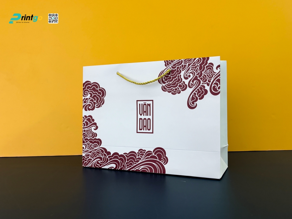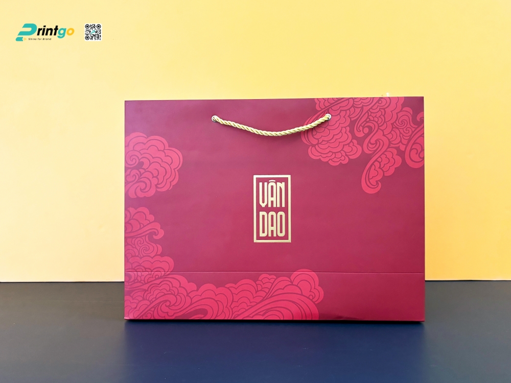 Túi giấy đồng bộ thương hiệu: Hoàn thiện bộ quà tặng là chiếc túi giấy đi kèm, được thiết kế đồng bộ với hộp quà. Túi sử dụng giấy Couche định lượng 300gsm (rất dày), đảm bảo khả năng chịu lực tốt cho set quà nặng từ 3-5kg. Bề mặt túi cũng được cán mờ đồng nhất với hộp, tạo sự liền mạch về hình ảnh thương hiệu từ ngoài vào trong. Quai túi được gia công đục oze (khoen kim loại) chắc chắn, xỏ dây tơ bóng, vừa thuận tiện cho việc xách mang đi biếu tặng, vừa tăng tính thẩm mỹ cho toàn bộ ấn phẩm.