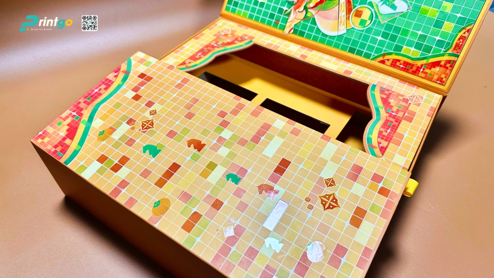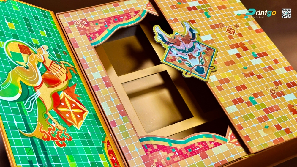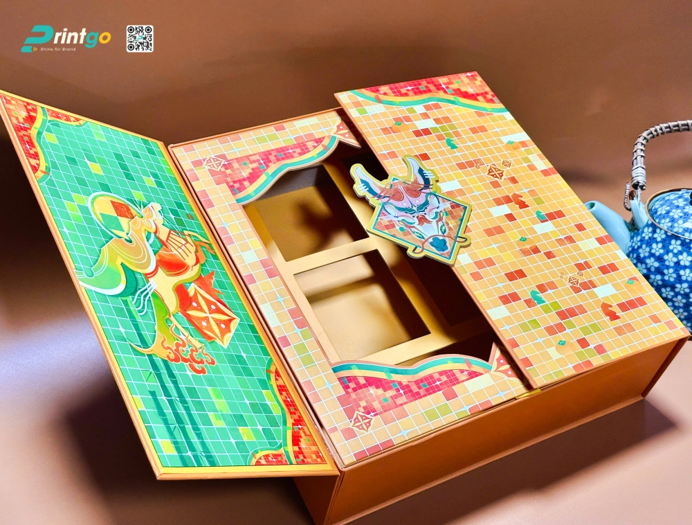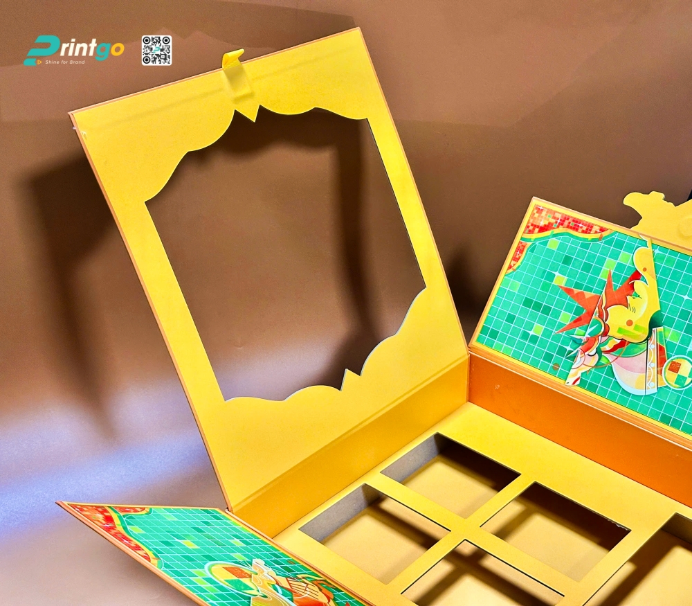 Printgo đã tư vấn và triển khai quy cách hộp cánh bướm (Butterfly Box) mở giữa cho dự án này. Khác với các loại hộp nắp âm dương hay nắp nam châm thông thường, hộp cánh bướm với thiết kế hai cánh mở sang hai bên tạo ra một hành vi mở hộp đầy tính nghi thức, tựa như việc mở ra cánh cổng bước vào một không gian lễ hội.