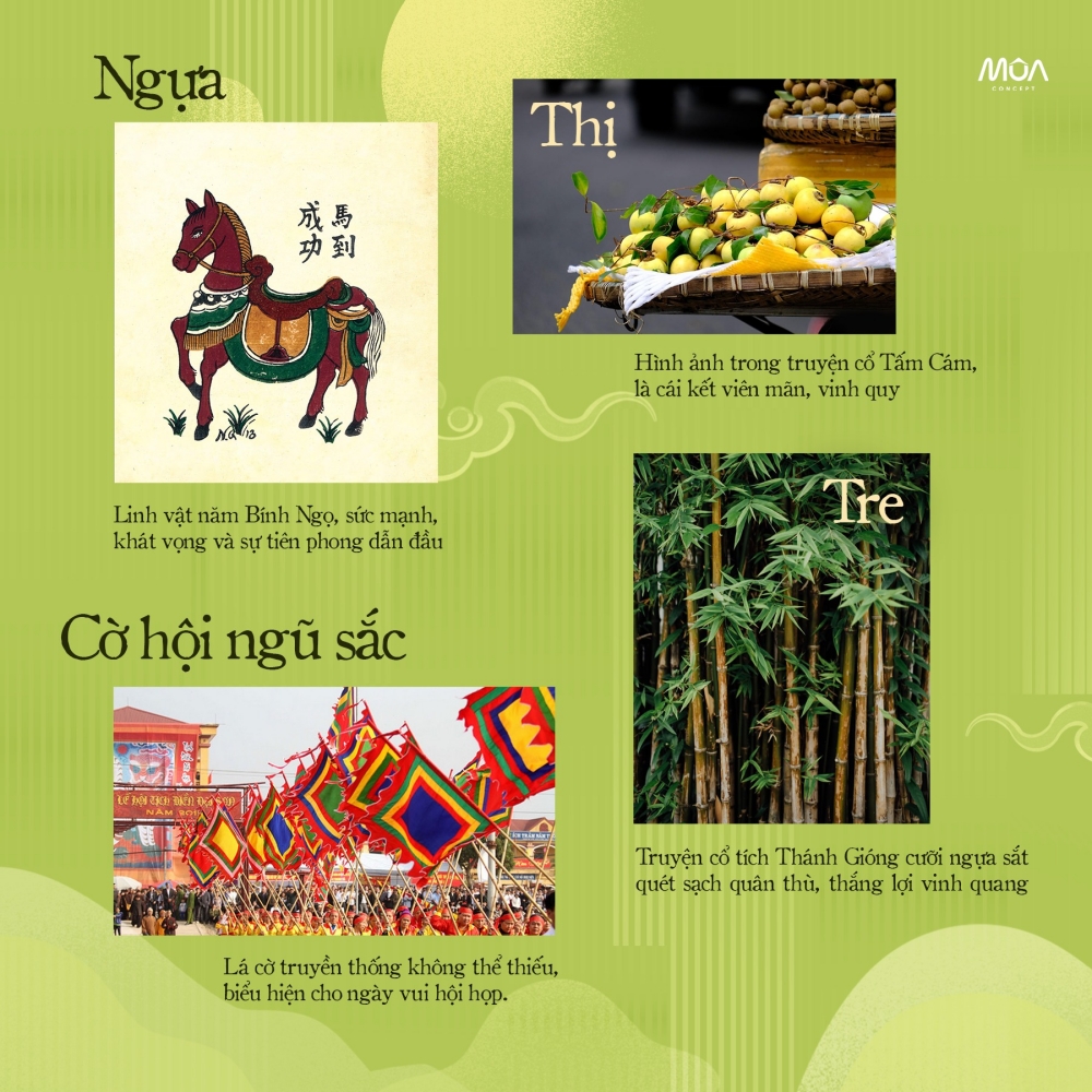 Chất liệu văn hóa Việt được chắt lọc tinh tế. Điều khiến bản thiết kế này trở nên đắt giá chính là cách các họa sĩ lồng ghép các biểu tượng văn hóa Việt một cách đầy ẩn ý. Chúng ta bắt gặp hình ảnh cô Tấm (Thị) bước ra từ quả thị thơm lừng trong truyện cổ tích Tấm Cám, biểu tượng cho cái kết viên mãn, sự hồi sinh và vinh quy bái tổ sau bao thăng trầm. Bên cạnh đó là hình ảnh cờ hội ngũ sắc tung bay phấp phới, gợi nhắc về không khí lễ hội mùa xuân, sự sum vầy và niềm vui truyền thống của dân tộc. Không thể thiếu là hình tượng Tre ngà gắn liền với truyền thuyết Thánh Gióng, đại diện cho sức mạnh nội tại, tinh thần quật cường và niềm tin chiến thắng bền bỉ của người Việt. Tất cả những chất liệu dân gian ấy không được minh họa một cách trực diện, sáo mòn mà được chuyển hóa tài tình thành ngôn ngữ đồ họa hiện đại, tạo nên chiều sâu biểu tượng khiến người xem phải dừng lại ngẫm nghĩ và chiêm nghiệm.