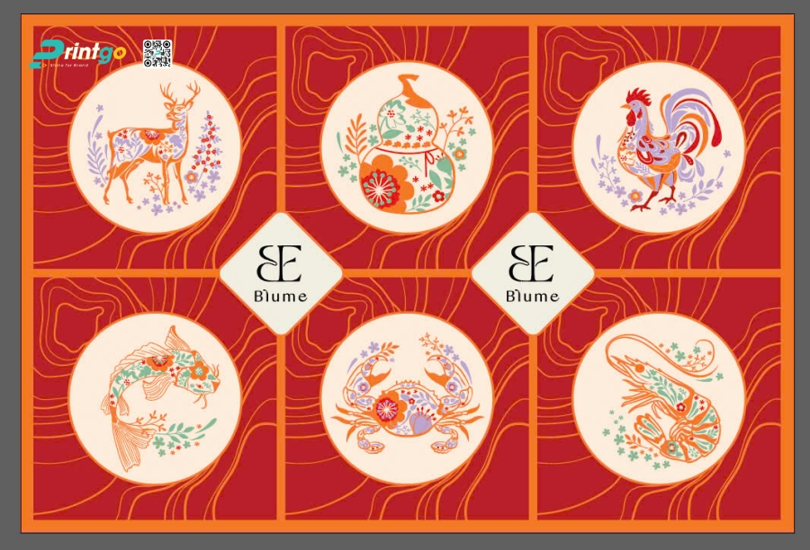Tuy nhiên, nếu chỉ sử dụng một màu đỏ, thiết kế có thể trở nên chói gắt và thiếu sự tinh tế. Để dung hòa, Printgo đã khéo léo phối hợp sắc đỏ cùng những đường nét và họa tiết màu vàng cam. Sự kết hợp này không chỉ tạo ra một hiệu ứng thị giác ấm áp, sang trọng – điều mà một thương hiệu cao cấp như Blume luôn hướng tới – mà còn gợi lên hình ảnh của sự sung túc, của mâm ngũ quả, của ánh đèn lồng trong đêm giao thừa.
