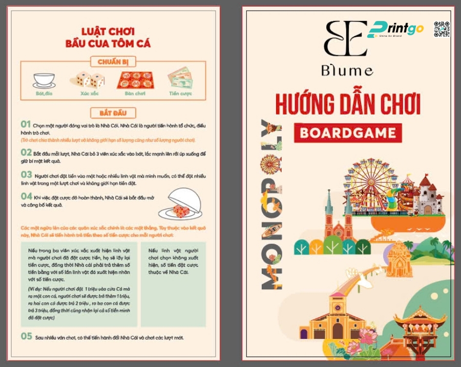 Hướng dẫn chơi: Một bộ quà tặng chuyên nghiệp không thể thiếu hướng dẫn sử dụng. Printgo thiết kế thẻ hướng dẫn chơi kích thước 10x17cm, vừa vặn để cầm tay. Thẻ gồm 2 mặt: Mặt trước là Luật chơi Bầu Cua Tôm Cá, và mặt sau là bản giới thiệu về ý nghĩa của Boardgame Blume. Nội dung luật chơi được trình bày khoa học, gọn gàng, dễ hiểu với các biểu tượng minh họa.