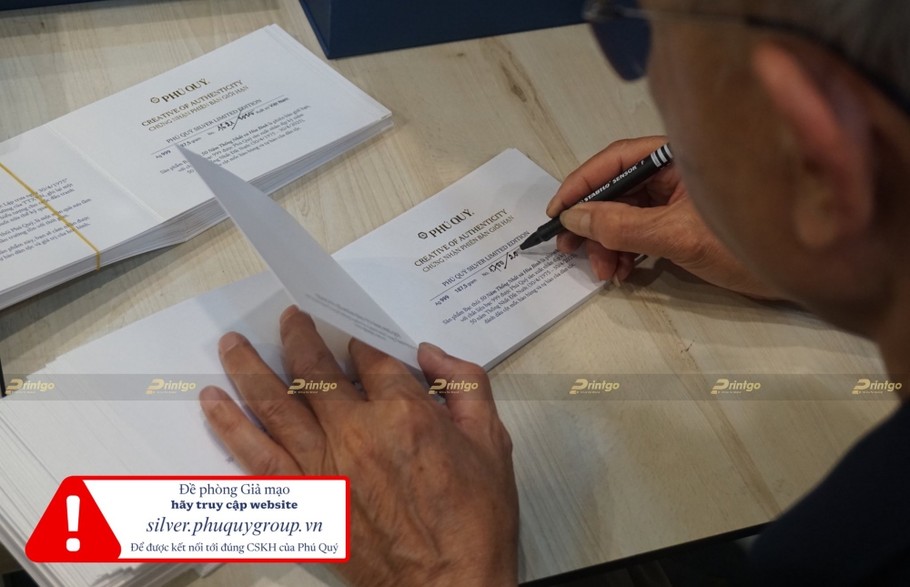 Để hoàn thiện bộ sản phẩm một cách trọn vẹn, Printgo cũng thiết kế thêm giấy chứng nhận và phong bì thư đi kèm, sử dụng chất liệu giấy mỹ thuật ánh trai – một loại giấy cao cấp có độ óng ánh nhẹ, tạo cảm giác sang trọng nhưng vẫn tinh tế. Bên trong không chỉ là lời tri ân lịch sự từ thương hiệu Phú Quý gửi đến khách hàng mà còn là một phần của trải nghiệm trọn vẹn mà Printgo xây dựng trong từng dự án.