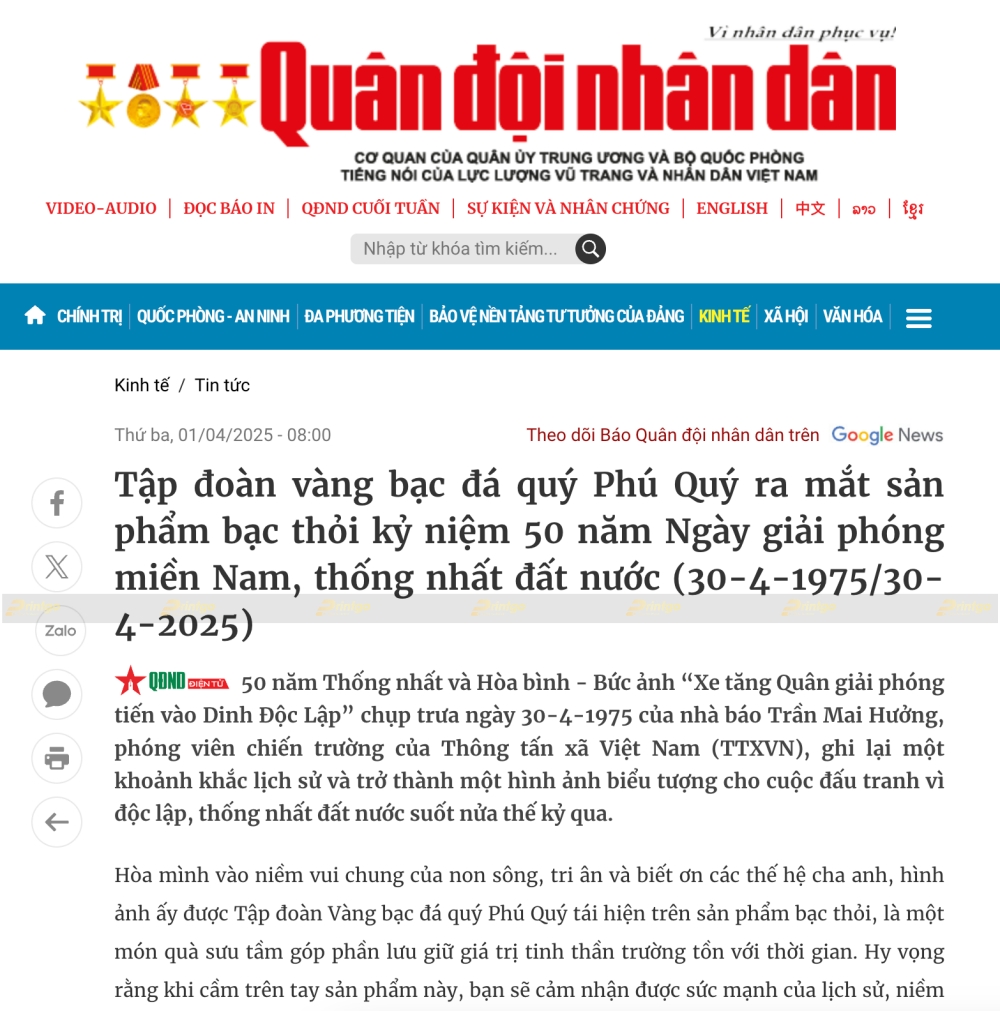 “Có những thời khắc đi qua không thể nào quên – có những biểu tượng khi được tái hiện, lập tức gợi về niềm tự hào, sự xúc động và tinh thần dân tộc mãnh liệt.” Đúng vào dịp trọng đại: kỷ niệm 50 năm ngày Giải phóng miền Nam, Thống nhất đất nước (30/04/1975 – 30/04/2025), thương hiệu vàng bạc Phú Quý đã cho ra mắt một sản phẩm vô cùng đặc biệt – bạc thỏi phiên bản giới hạn khắc họa hình ảnh lịch sử: chiếc xe tăng thần tốc húc đổ cổng Dinh Độc Lập – biểu tượng cho giây phút đất nước hoàn toàn giải phóng. Đây không đơn thuần là một sản phẩm bạc – mà là một biểu tượng lịch sử, một món quà tinh thần, gói trọn lòng biết ơn và sự tôn kính dành cho thế hệ cha ông.
