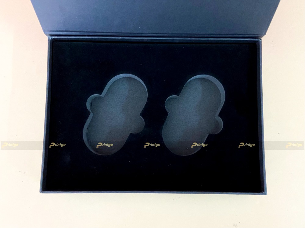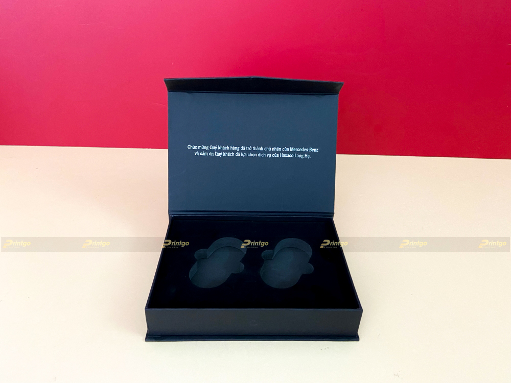 Sự sang trọng không chỉ dừng lại ở vẻ bề ngoài. Printgo tin rằng trải nghiệm đẳng cấp phải được chăm chút trong từng chi tiết, đặc biệt là không gian bên trong hộp. Khi mở hộp ra, khách hàng sẽ được chào đón bởi một nội thất được đầu tư kỹ lưỡng. Khay đựng chìa khóa được làm từ chất liệu cao su non – một loại mút xốp có độ đàn hồi cao, chống sốc tốt. Bề mặt của khay được bồi một lớp nhung đen tuyền, mang lại cảm giác mềm mại, êm ái và vô cùng sang trọng. Sự kết hợp này không chỉ bảo vệ chiếc chìa khóa khỏi mọi trầy xước mà còn tôn vinh nó như một món trang sức quý giá. Đặc biệt hơn, phần khay đựng này được bế một cách chi tiết và chính xác tuyệt đối theo hình dáng của chiếc chìa khóa xe Mercedes. Điều này có nghĩa là chiếc chìa khóa sẽ nằm vừa vặn, được "ôm trọn" trong khuôn định hình, không bị xê dịch. Ưu điểm của việc bế chi tiết này là rất lớn: nó thể hiện sự chuyên nghiệp, sự đầu tư tỉ mỉ và sự tôn trọng của thương hiệu đối với cả sản phẩm và khách hàng.