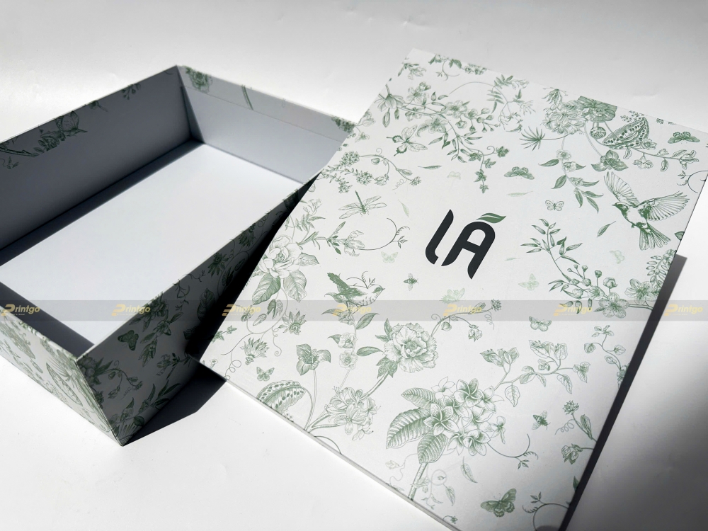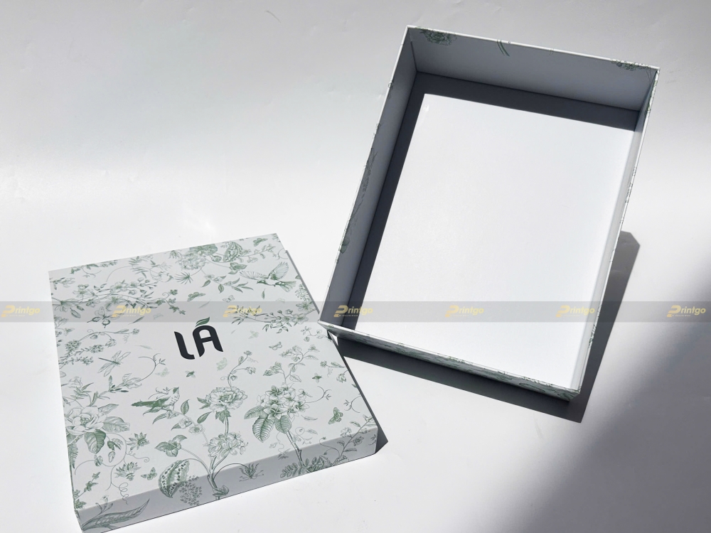 Bên cạnh đó, chất liệu Carton lạnh được lựa chọn làm vật liệu chính cho hộp, mang lại độ cứng cáp và khả năng chống va đập tốt, giúp bảo vệ sản phẩm bên trong một cách tối ưu. Khi kết hợp với lớp giấy couche bồi bên ngoài, bề mặt hộp trở nên mịn màng, dễ dàng in ấn, đồng thời tạo ra một lớp bảo vệ ngoài cùng giúp sản phẩm thêm phần bền đẹp và sang trọng. Sự kết hợp này mang đến một hộp quà hoàn chỉnh, vừa thẩm mỹ vừa đảm bảo chất lượng, góp phần tôn vinh giá trị sản phẩm bên trong.