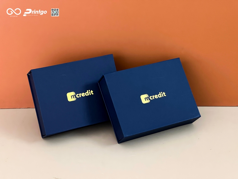 Điểm nhấn duy nhất xuất hiện trên nắp hộp chính là logo Mcredit. Việc đặt logo ở vị trí trung tâm trên một nền màu phẳng và sâu tạo ra một lực hút thị giác mạnh mẽ. Điều này giúp khách hàng ngay lập tức nhận diện thương hiệu và ghi nhớ sâu sắc về sự hiện diện của Mcredit trong tâm trí. Sự tinh giản này đòi hỏi sự hoàn hảo trong từng đường nét của bao bì, bởi khi không có hoa văn che đậy, bất kỳ một lỗi nhỏ nào cũng sẽ lộ rõ. Nhưng với Printgo, sự hoàn mỹ chính là tiêu chuẩn bắt buộc.