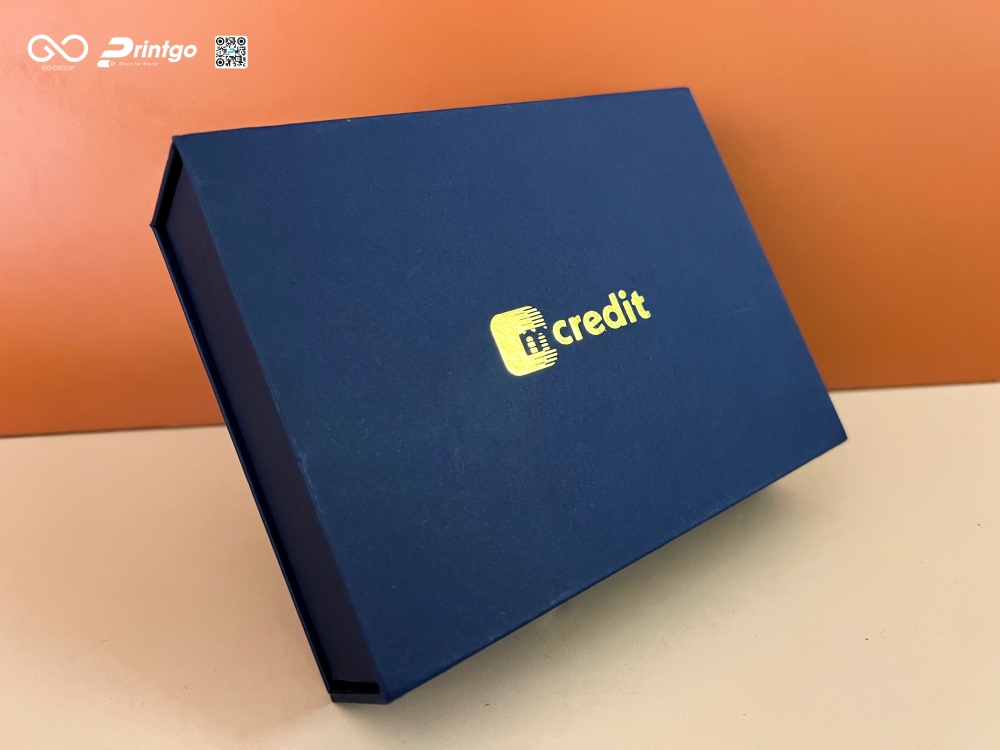 Nếu màu xanh và chất liệu giấy tạo nên nền tảng bền vững, thì kỹ thuật gia công ép nhũ chính là yếu tố tạo nên sự bùng nổ về thị giác. Logo Mcredit được thực hiện gia công ép nhũ vàng đồng (Gold Foil Stamping). Đây là quá trình sử dụng nhiệt và lực ép để chuyển lớp màng kim loại cực mỏng từ dải nhũ sang bề mặt giấy thông qua một khuôn đồng được chế tác riêng biệt. Ánh kim vàng đồng trên nền xanh Patriot Blue tạo nên một hiệu ứng tương phản đẳng cấp. Sắc vàng không chỉ đại diện cho sự giàu sang, thịnh vượng mà trong phong thủy tài chính, nó còn tượng trưng cho năng lượng tích cực và sự tăng trưởng. Dưới các góc ánh sáng khác nhau, logo Mcredit sẽ phản chiếu những tia sáng lấp lánh, giúp bộ quà tặng trở nên rực rỡ và cuốn hút dù nhìn từ xa hay nhìn gần.