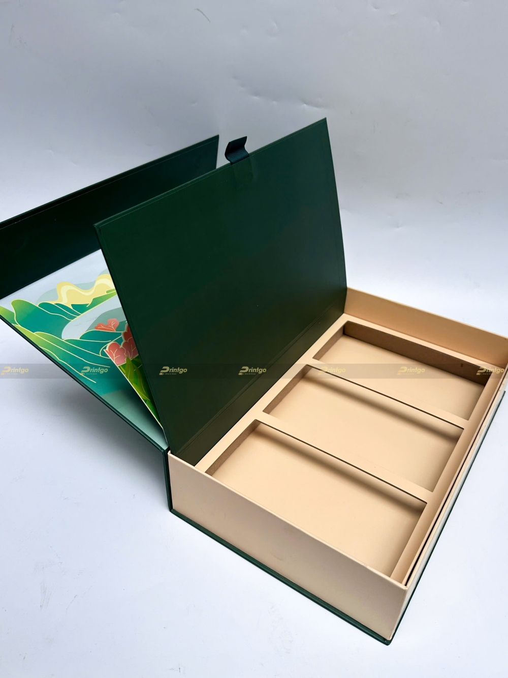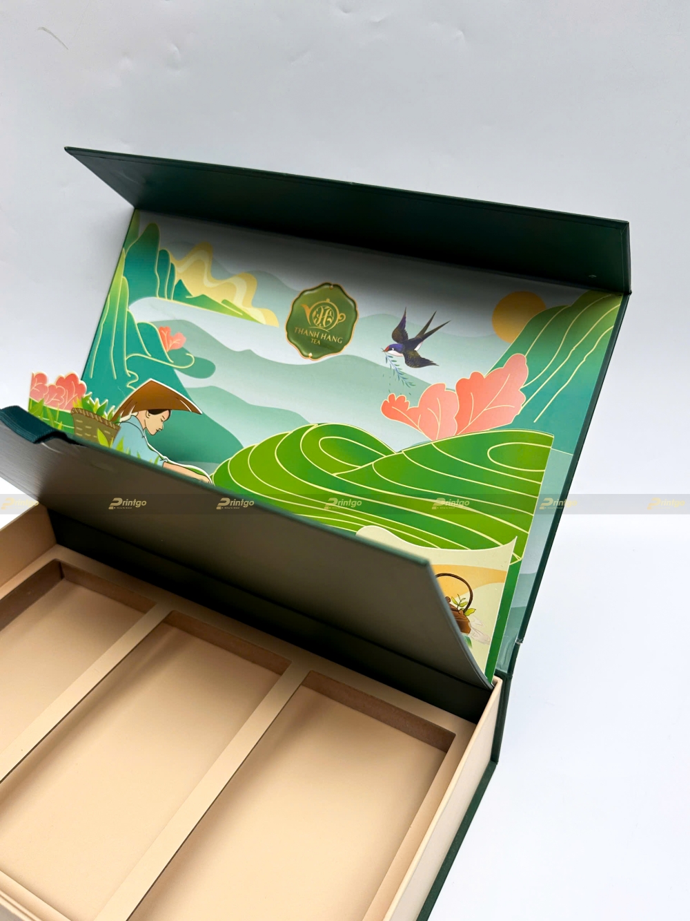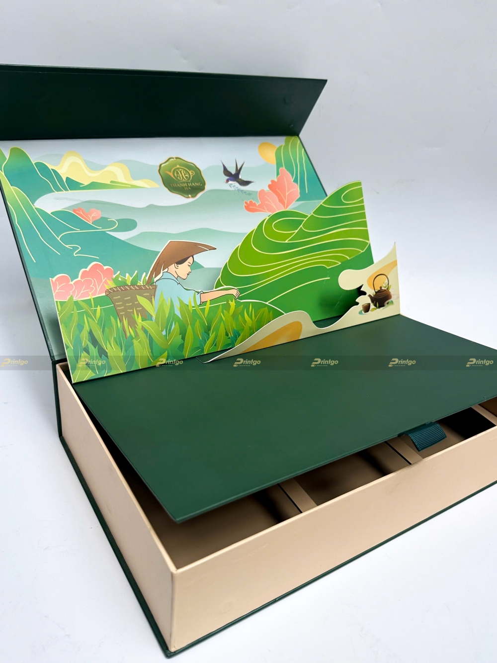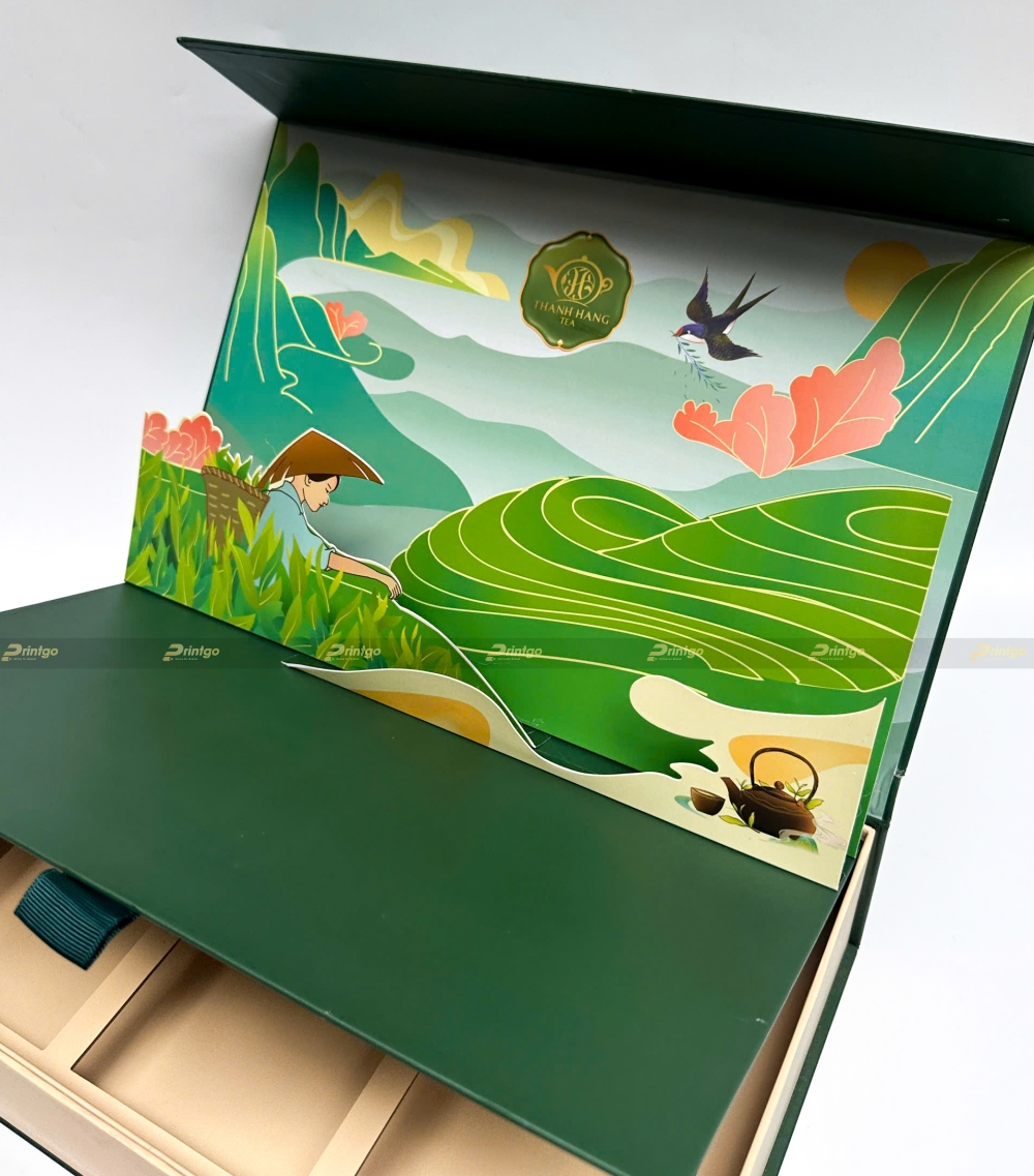 Để tạo nên một bao bì vừa sang trọng lại vừa ấn tượng, Printgo đã lựa chọn quy cách hộp nam châm nắp lật để in hộp trà Thanh Hằng. Quy cách này không chỉ mang đến sự tiện lợi trong việc đóng mở hộp mà còn tạo cảm giác mới mẻ, tinh tế cho người sử dụng ngay từ lần chạm đầu tiên. Phần nắp phụ bên trong hộp được thiết kế đặc biệt với hiệu ứng pop-up 3D ba lớp, tạo nên một không gian nổi bật, thu hút ánh nhìn. Khi mở nắp, phần 3D này như một khối hình học sống động, mang đến trải nghiệm độc đáo và bất ngờ cho người tiêu dùng. Các chi tiết này được cắt CNC tỉ mỉ, đường nét sắc sảo và chính xác, giúp tạo nên sự tinh xảo, thể hiện rõ nét sự chăm chút trong từng khâu gia công. Printgo, với kinh nghiệm nhiều năm trong ngành thiết kế và gia công bao bì, đã thực hiện hàng loạt dự án có sử dụng hiệu ứng 3D, mang đến cho khách hàng những sản phẩm bao bì độc đáo, ấn tượng. Những dự án này đã nhận được sự đánh giá cao nhờ vào sự sáng tạo, tinh tế và sự kết hợp hoàn hảo giữa công nghệ và thiết kế. Chúng tôi luôn tự hào là đối tác đáng tin cậy, mang đến những bao bì chất lượng cao, giúp các thương hiệu tạo dựng sự khác biệt và đẳng cấp trên thị trường.