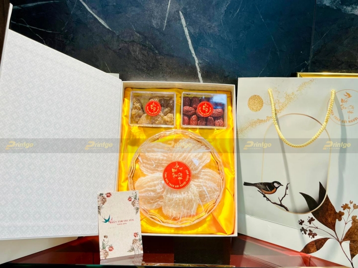Với những sản phẩm cao cấp như yến sào, hộp đựng không chỉ đơn thuần là một chiếc hộp để chứa sản phẩm mà còn là một phần không thể thiếu trong trải nghiệm của khách hàng. Một chiếc hộp được thiết kế tỉ mỉ, tinh tế không chỉ bảo vệ sản phẩm bên trong mà còn nâng tầm giá trị của sản phẩm, thể hiện sự đẳng cấp và sang trọng của thương hiệu. Hơn nữa, hộp đựng còn là một công cụ marketing hiệu quả, giúp sản phẩm tạo được ấn tượng sâu sắc trong lòng khách hàng và khẳng định vị thế trên thị trường. Thấu hiểu được nhu cầu của người tiêu dùng, thương hiệu Nhất Tâm Chi Yến đã lựa chọn Printgo để sản xuất bộ bao bì độc quyền, mang dấu ấn riêng. Bộ bao bì được thiết kế tinh tế, sang trọng, thể hiện sự đẳng cấp của sản phẩm.