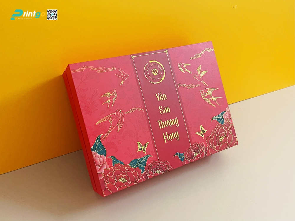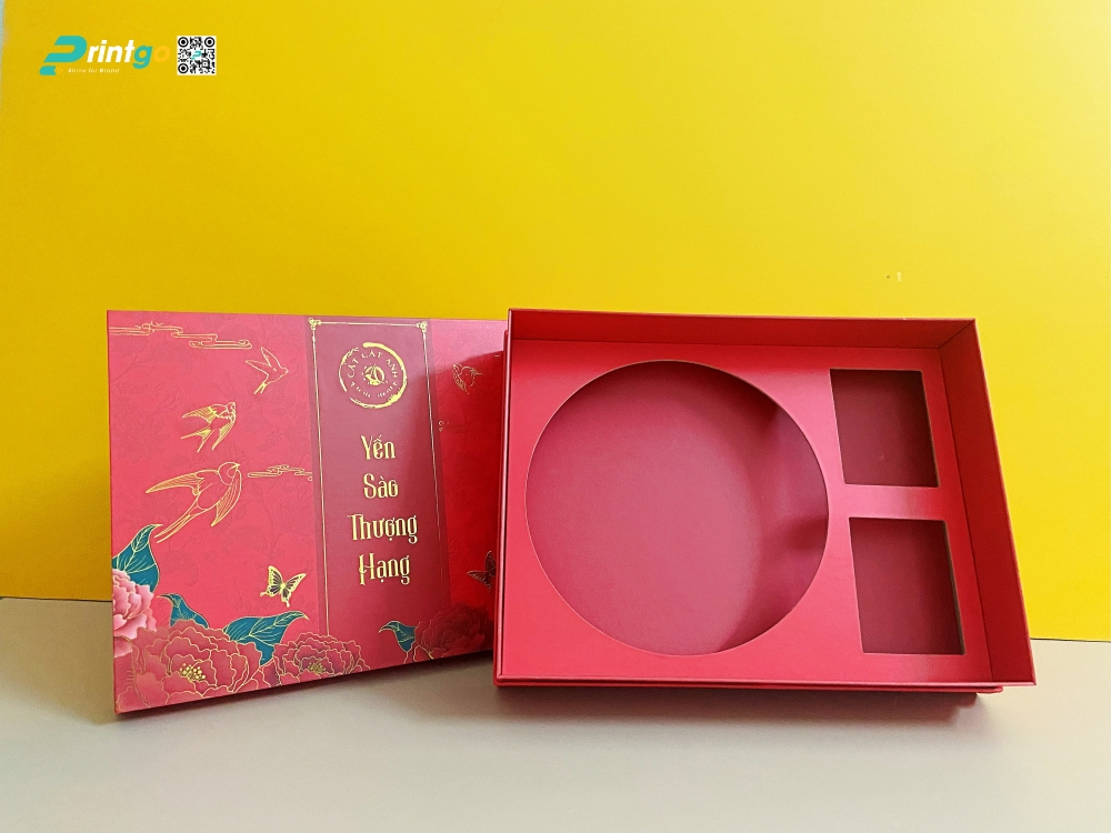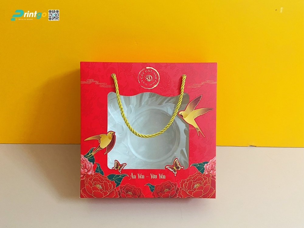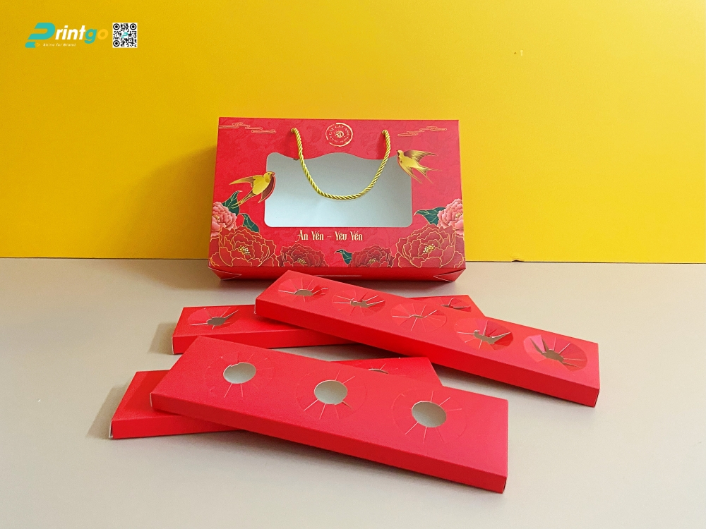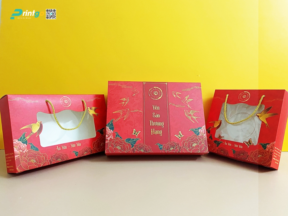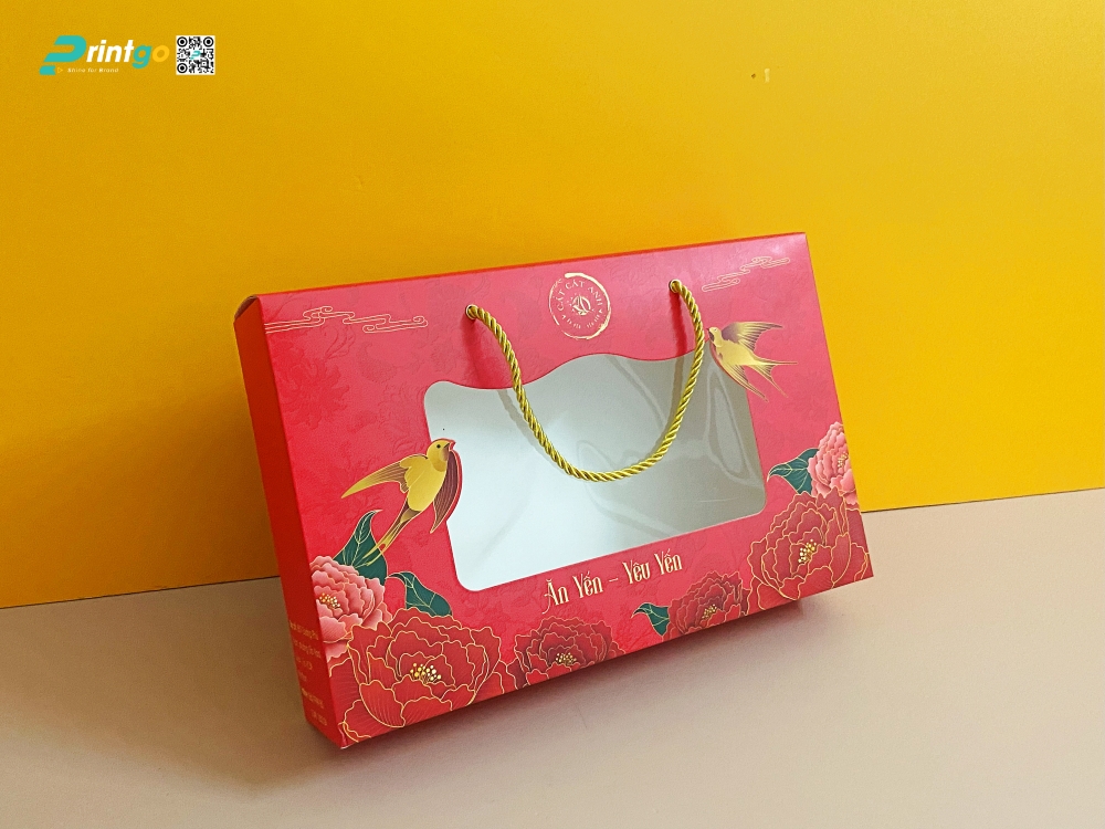 Để tối ưu chi phí nhưng vẫn đảm bảo sự sang trọng, Printgo đề xuất in hộp yến với quy cách hộp nắp mở đáy gài có quai xách. Đây là một thiết kế thông minh khi tích hợp quai xách trực tiếp vào hộp, loại bỏ nhu cầu sử dụng túi giấy đi kèm, vừa tiện lợi vừa thân thiện với môi trường. Hộp được làm từ giấy Ivory định lượng cao. Đây là loại giấy có độ cứng tốt, bề mặt hơi nhám nhẹ, mang lại cảm giác sang trọng và chất lượng in ấn vẫn rất đảm bảo.
